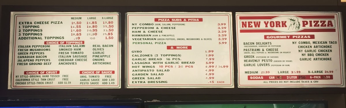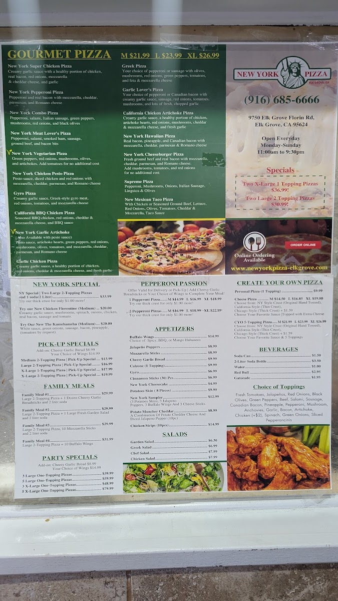 The menu at New York Pizza - Elk Grove Florin Rd offers a wide variety of options that cater to every taste, from classic pizzas to calzones and sides. For pizza lovers, there's the option to Create Your Own New York Pizza with up to five toppings, available in sizes from 10" Small to 16" X-Large. If you're in the mood for something a bit more indulgent, their Supreme Gourmet Pizzas like NY Chicken Pesto (14" Large) and California BBQ Chicken (10" Small) stand out. Traditional pizza enthusiasts can enjoy the NY Meat Lovers (16" X-Large) or Supreme Pizza (10" Small), while vegetarians can delight in the NY Vegetarian (14" Large). For something extra, you can grab a calzone, with choices like the Calzone With Two Toppings. If you're craving a hearty side, options like Chicken Nuggets (10 Pc) and Mozzarella Sticks are perfect accompaniments. For a quick bite, their Pick Up Specials offer combos like Large Pepperoni Pizza and 10 Buffalo Wings or X-Large 3 Topping Pizza with Garlic Breadsticks. Don't forget to end your meal with something sweet, like Cinnamon Sticks or Cheesecake (including a Strawberry Swirl variation). The restaurant also offers a selection of beverages including Gatorade, Soda (2 Ltr Bottled), and even Red Bull. Whether you’re stopping by for a solo meal or feeding the family, New York Pizza provides a tasty, satisfying experience with a variety of flavors and meal combinations.